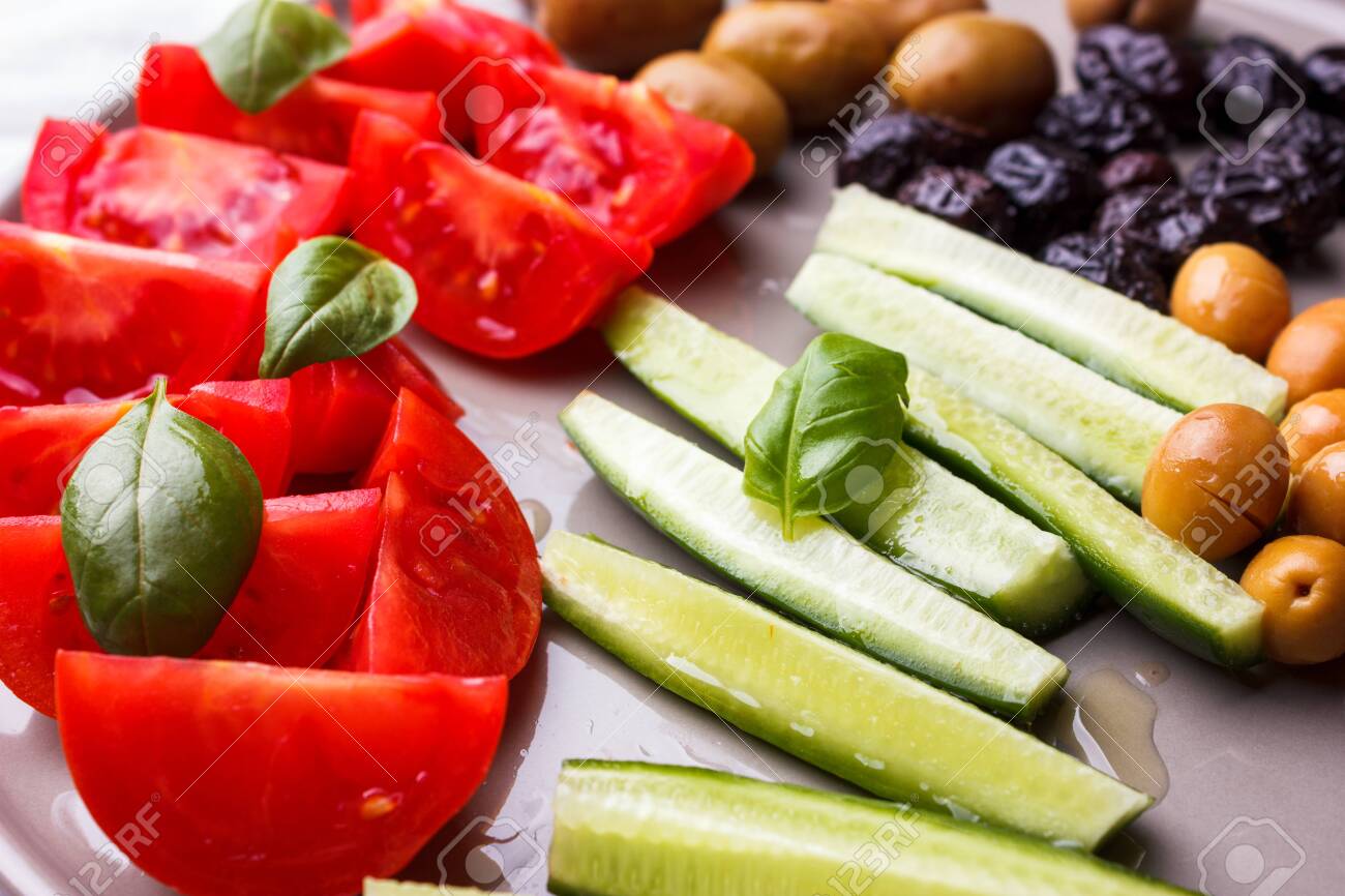 SO! How do I take all these ingredients and set my plates? Well, I start with the tomatoes and cucumbers..Depending on how many people dictates if they are place together on one plate or divided into 2. After slicing both, I drizzle with olive oil, dash or 2 of salt, and a sprinkle of Mediterranean oregano (kekik). Next come the olives: I like to add olive oil to those and some various hot pepper flakes over them for extra flavor.