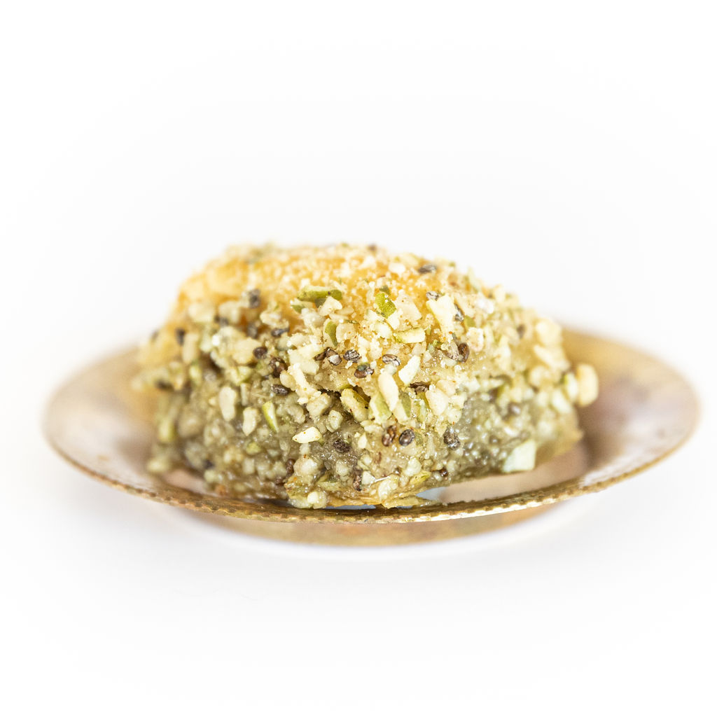 We understand many have nut allergies. Understanding that those allergies stem from tree nutes, we chose to make our Bird Seed baklava nut free made with sunflower seeds, pumpkin seeds, and chia seeds