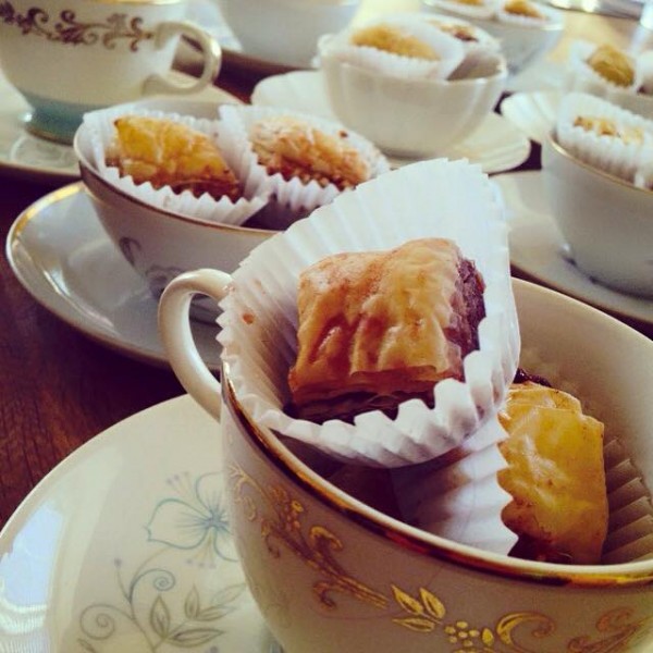 Give the gift of relaxation. Bundle includes Vintage teacup/saucer, tea sachet, 3 pieces of baklava