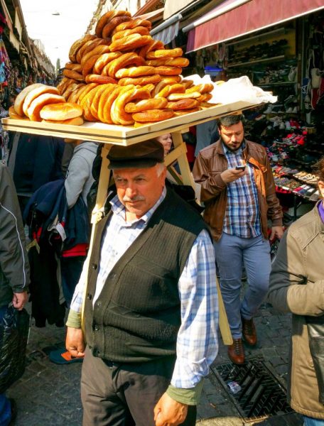 Sufi historian, Evliya Celebi writes about how the palace would order simits each morning from the bakeries in Istanbul around 1660. He described Istanbul’s simit sellers in his famous book Seyahatname, “There were a total of 300 sellers and 70 bakeries that made simit five times each day. The last batch came out after dark, and the sellers threaded the rings onto long sticks fixed into the corners of their baskets or trays, and hung a small lantern at the top to attract the attention of the crowds on their way home after work.”
